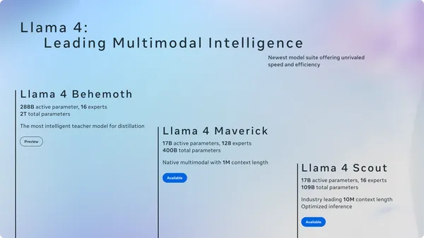 Meta AI는 natively multimodal AI 혁신의 새로운 시대를 여는 Llama 4 모델군을 발표했습니다. 이 발표의 핵심은 두 가지 새로운 open-weight 모델인 Llama 4 Scout와 Llama 4 Maverick, 그리고 현재 훈련 중인 강력한 teacher 모델인 Llama 4 Behemoth입니다.