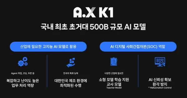 기술적 특징으로, 'A.X K1'은 영어 중심의 기존 AI 모델과 달리 처음부터 한국어 학습에 특화되도록 설계되어 자연스러운 한국어 이해 능력을 제공한다. 이를 통해 한국 문화, 경제, 역사를 이해하는 국민 맞춤형 서비스 구축에 적합하다.