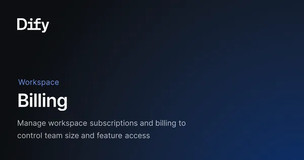 Billing 개요: Dify의 Billing은 Workspace 단위로 적용되며, 선택한 Subscription Plan에 따라 팀 멤버 수, 사용 가능한 기능, 그리고 사용량 할당량(usage quotas)이 결정됩니다.