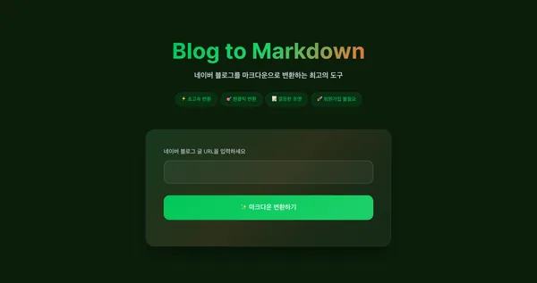 4. **자동 실행 URL 파라미터:** URL에 ?url= 파라미터를 추가하여 자동으로 변환을 시작하는 기능(https://blog-to-markdown.usefullabs.co.kr/?url=https://blog.naver.com/username/blog_id와 같은 형식)은 GET request의 query string을 활용하여 사용자 입력을 자동화하고 workflow를 간소화하는 API 지향적 인터페이스를 제공함을 의미합니다. 이는 백엔드 시스템이 해당 query parameter를 parsing하여 target URL을 식별하고 즉시 변환 프로세스를 트리거하도록 설계되었음을 나타냅니다.